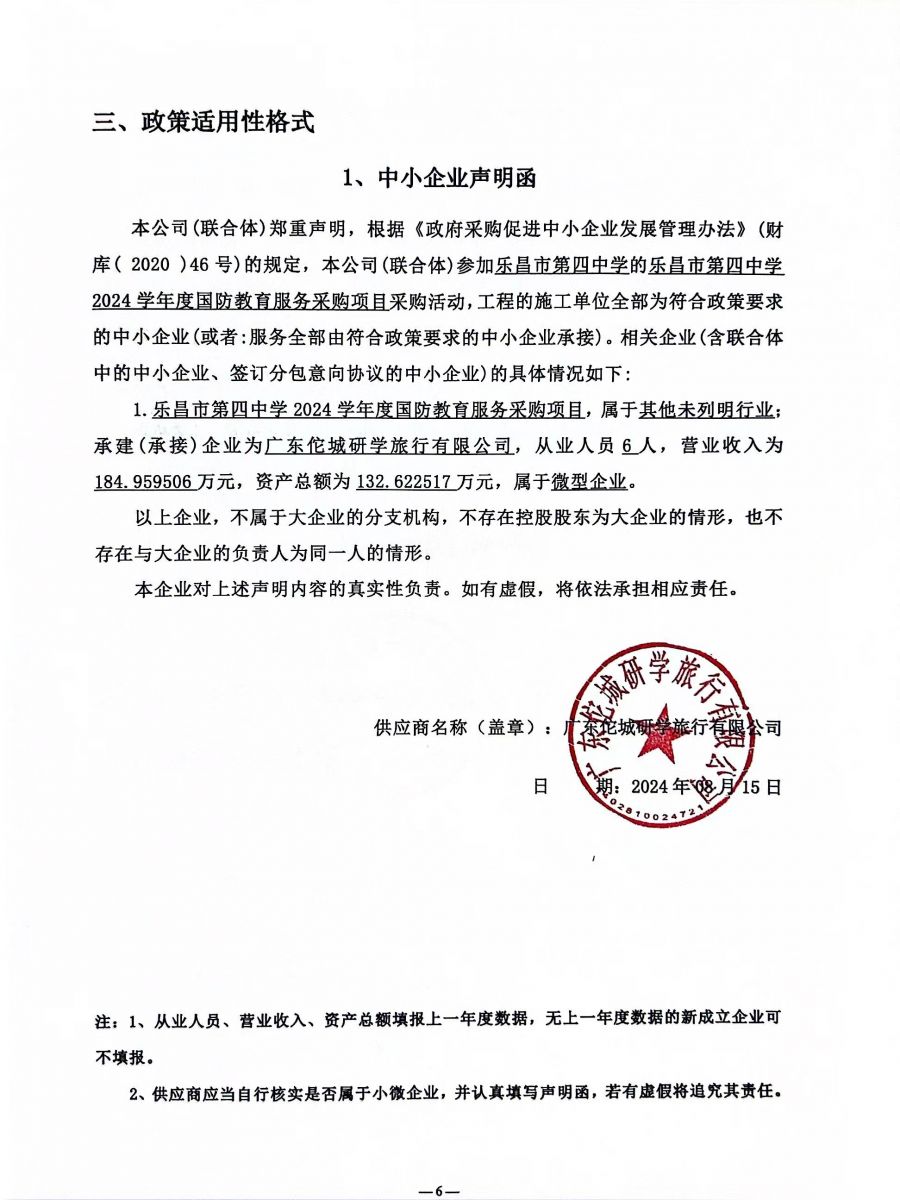 二、项目名称:乐昌市第四中学2024学年度国防教育服务采购项目